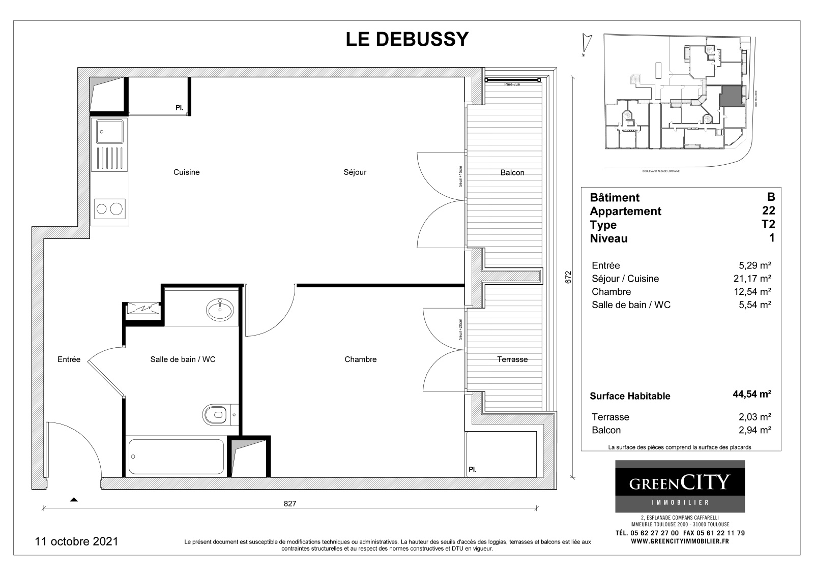 Cet appartement est composé d'une Cuisine ouverte sur un séjour baigné de lumière, ne chambre confortable, une salle d’eau et • WC séparés pour plus de praticité.
